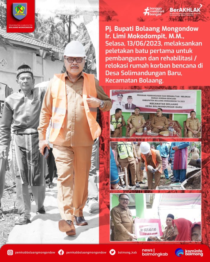 BOLMONG, DETOTABUAN.COM – Penjabat Bupati Bolmong Ir Mokodompit MM, akhirnya membuktikan merealisasikan pembangunan rumah korban longsor di desa Solimandungan baru (Solbar), kecamatan Bolaang. Ini dilakukan melalui peletakan batu pertama dalam pembangunan rumah bagi korban bencana tersebut, Selasa (13/6/2023) siang.
