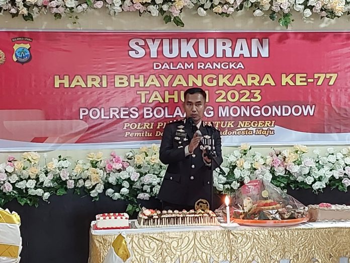 BOLMONG, DETOTABUAN.COM – Polres Bolaang Mongondow (Bolmong) pagi tadi, usai melaksanakan upacara peringatan HUT Bhayangkara ke-77 dilapangan olahraga kantor Bupati, dilanjutkan dengan acara syukuran sore pada pukul 15.00 bertempat diloby kantor polres Bolmong di desa Dulangon, kecamatan Lolak, Sabtu (1/7/2023).