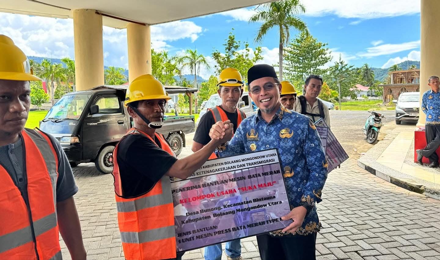 BOLMUT, Detotabuan.com — Bupati Bolaang Mongondow Utara (Bolmut) Dr. Sirajudin Lasena, SE., M.Ec.Dev., menyerahkan bantuan berupa mesin paving blok dan bata merah kepada lima kelompok usaha masyarakat.