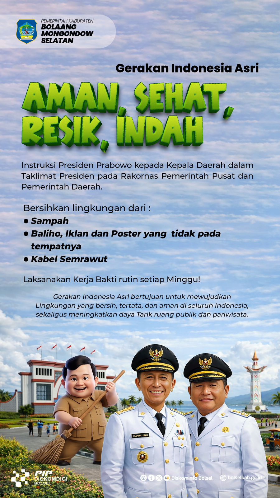 Detotabuan.com,BOLSEL – Pemerintah Kabupaten Bolaang Mongondow Selatan (Bolsel) menegaskan komitmennya dalam mendukung Gerakan Indonesia Asri sebagai langkah konkret menciptakan lingkungan yang aman, sehat, bersih, dan indah.