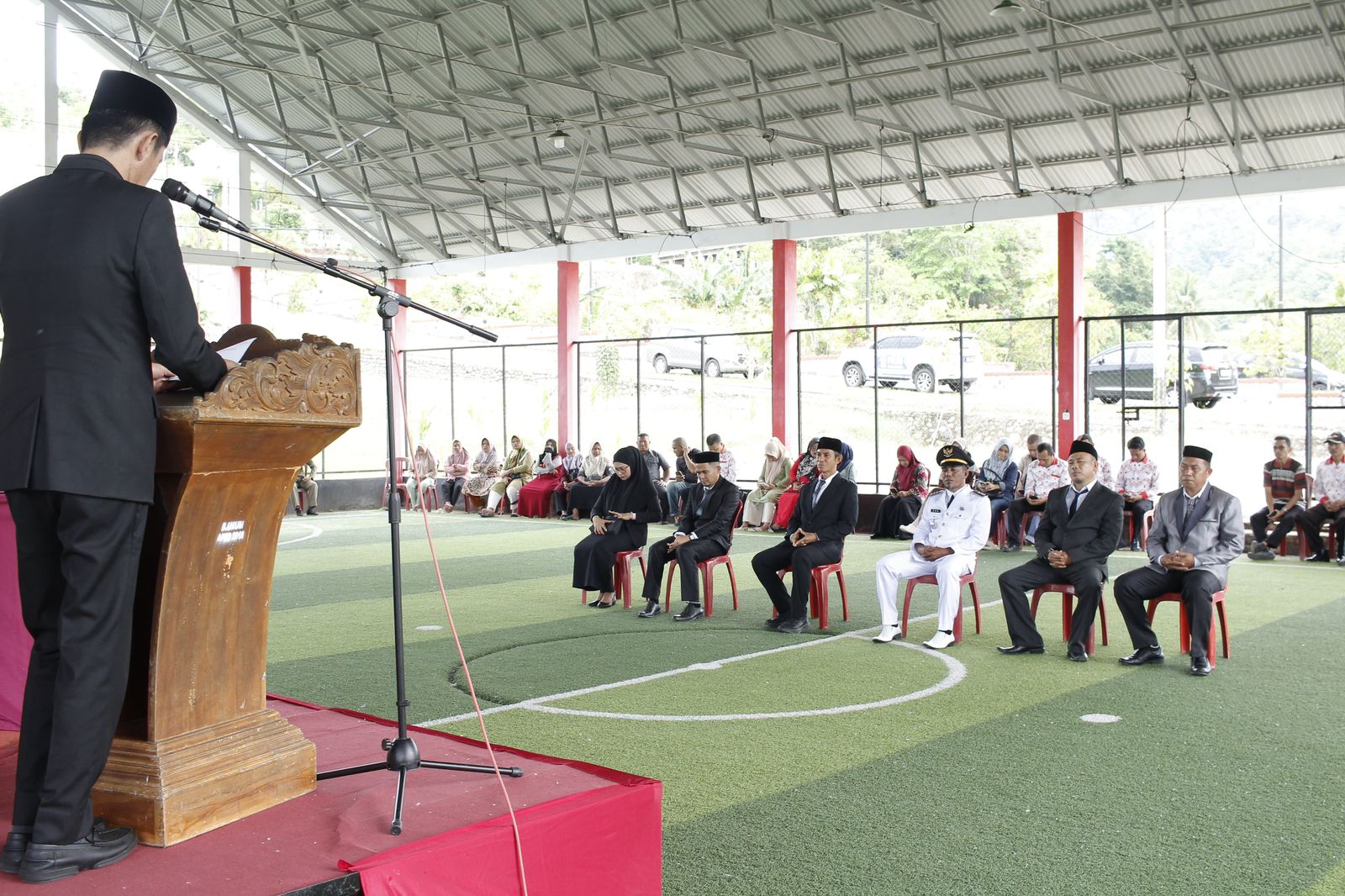Prosesi pelantikan yang berlangsung khidmat ini digelar di Lapangan Futsal Kawasan Perkantoran Panango, Kecamatan Bolaang Uki, Jumat (20/2/2026) pagi. Di bawah mendung tipis yang menyelimuti Panango, deretan pejabat tampak tegap mengikuti prosesi sakral tersebut.