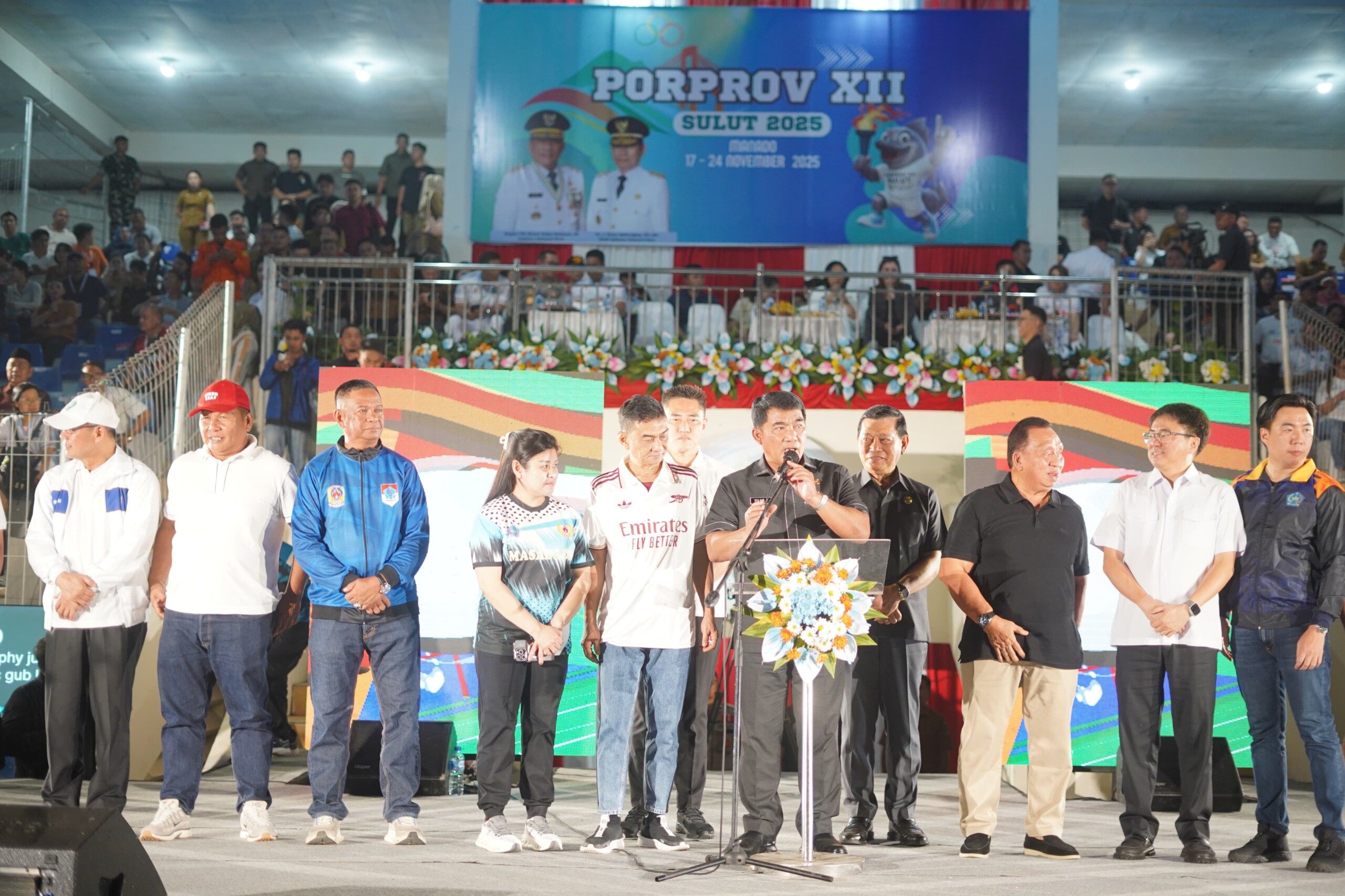 Sebelum memberikan sambutan, Gubernur Sulawesi Utara mengundang seluruh bupati dan wali kota yang hadir untuk mendampingi beliau di atas panggung. Dalam sambutannya, Gubernur menyampaikan apresiasi setinggi-tingginya kepada panitia, atlet, serta seluruh pihak yang telah menyukseskan Porprov XII.