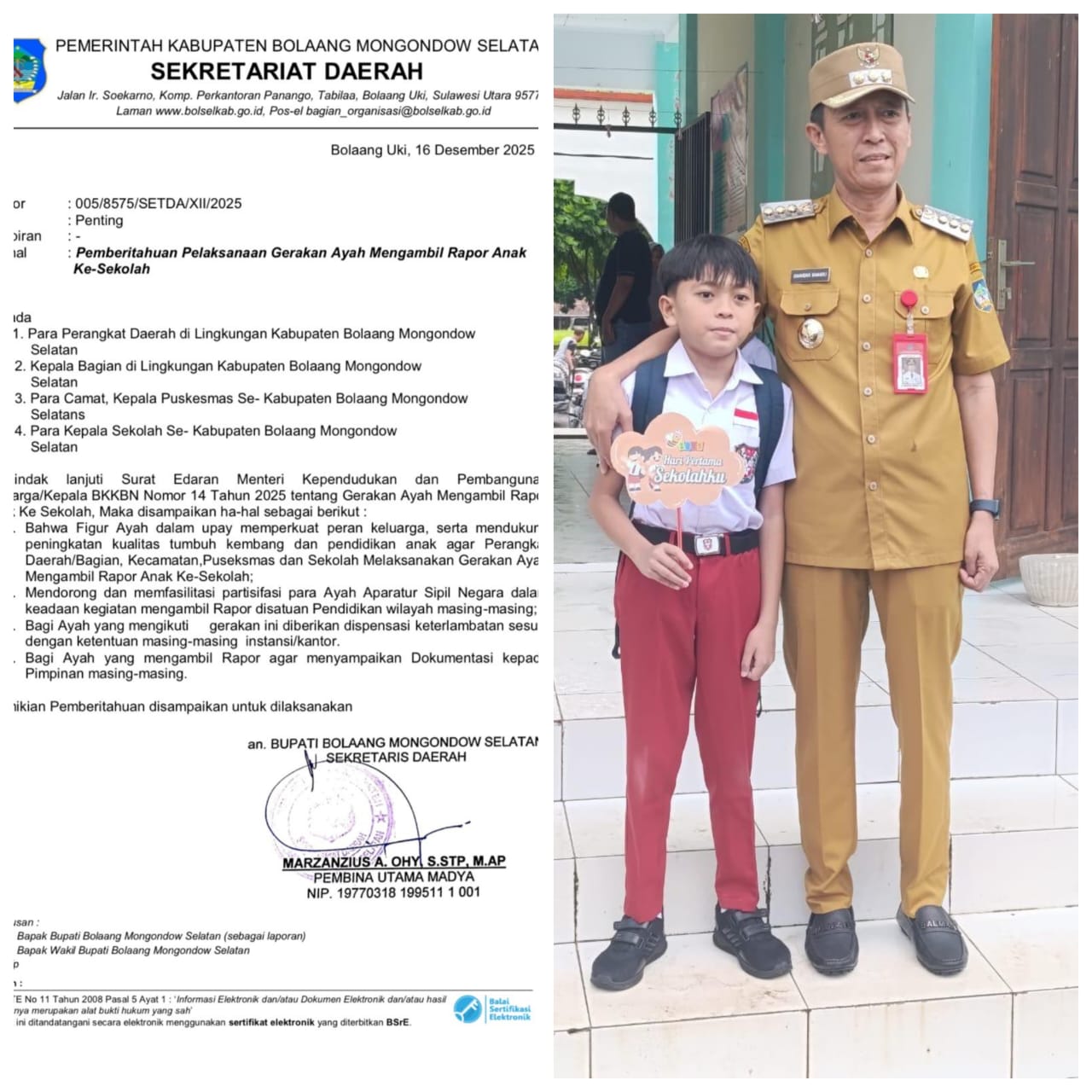 Melalui penerbitan Surat Edaran tentang Pelaksanaan Gerakan Ayah Mengambil Rapor Anak ke Sekolah, Pemda Bolsel menegaskan pentingnya keterlibatan figur ayah dalam proses tumbuh kembang dan pendidikan anak.