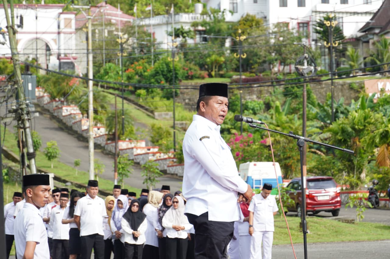 Dengan mengenakan pakaian putih Hitam, Wabup Deddy berdiri tegak di tengah lapangan apel, membacakan sambutan resmi Menteri Kesehatan RI, Budi Gunadi Sadikin. Dalam amanat tersebut, Menkes mengingatkan pentingnya menjaga semangat gotong royong dan memperkuat kolaborasi antar sektor untuk mewujudkan sistem kesehatan nasional yang tangguh.