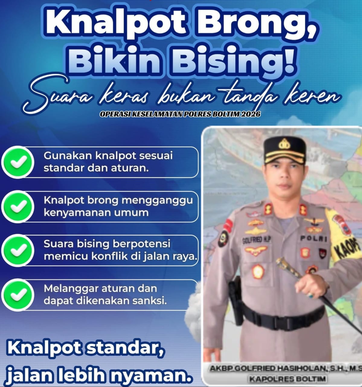 Ia meminta warga untuk kembali menggunakan knalpot standar pabrikan demi menghormati sesama pengguna jalan.
