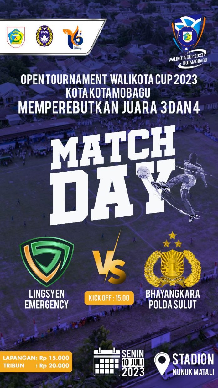 KOTAMOBAGU,DETOTABUAN.COM-Laga final perebutan juara 3 Turnamen Sepakbola Wali Kota Cup V, mempertemukan dua tim hebat di Stadion Nunuk Matali pada, Senin (10/07/2023) pukul 15:15 Wita