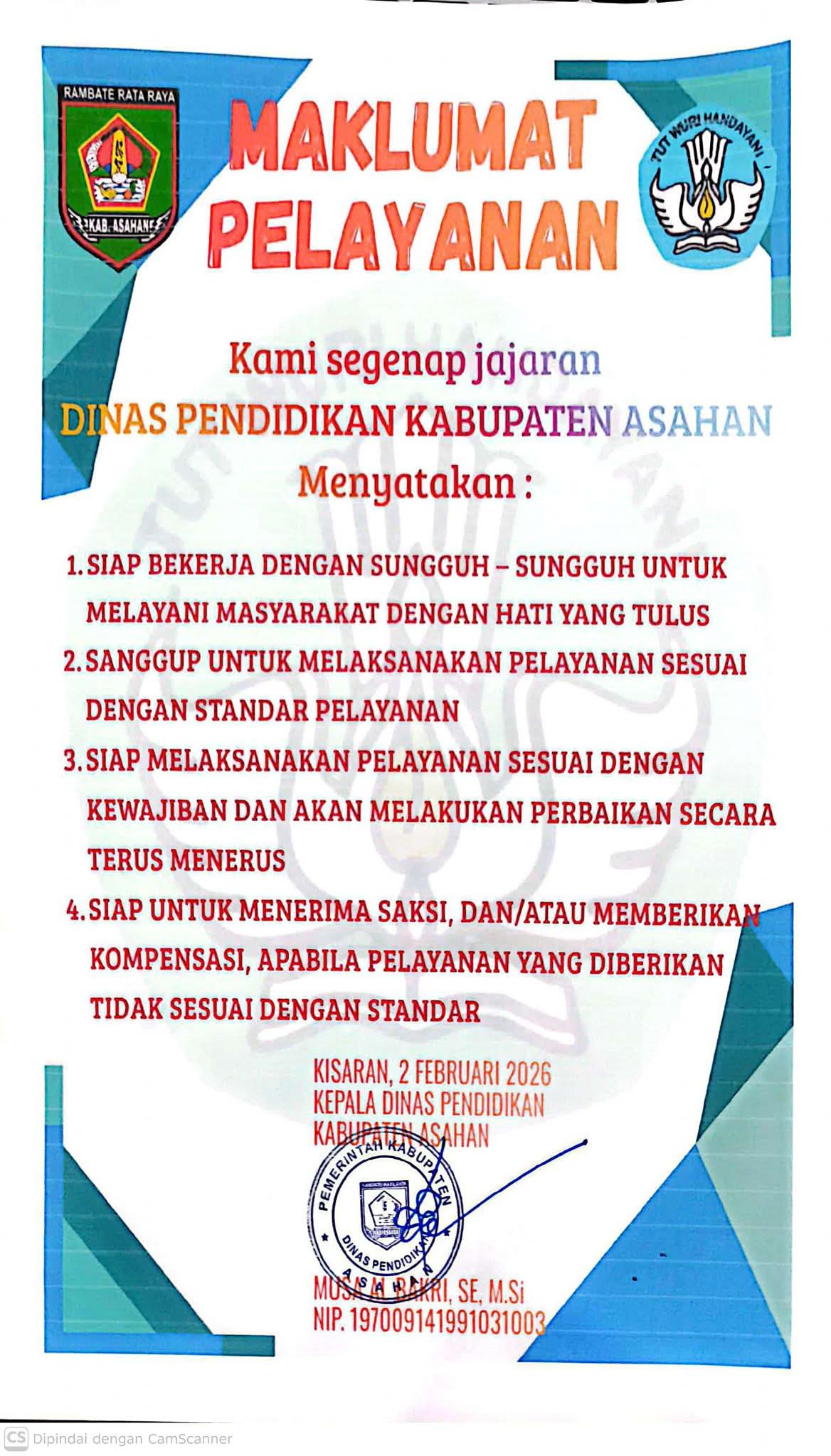 Mengawal kualitas pelayanan, Dinas Pendidikan Kabupaten Asahan mengeluarkan maklumat pelayanan kepada publik.