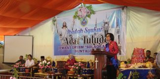 BOLMONG,DETOTABUAN.COM – Bupati Bolaang Mongondow Dra. Hj. Yasti Soepredjo Mokoagow, Kamis (7/2/2019), menghadiri Perayaan Adat Tulude yang dilaksanakan oleh Jemaat GMIBM Solagratia