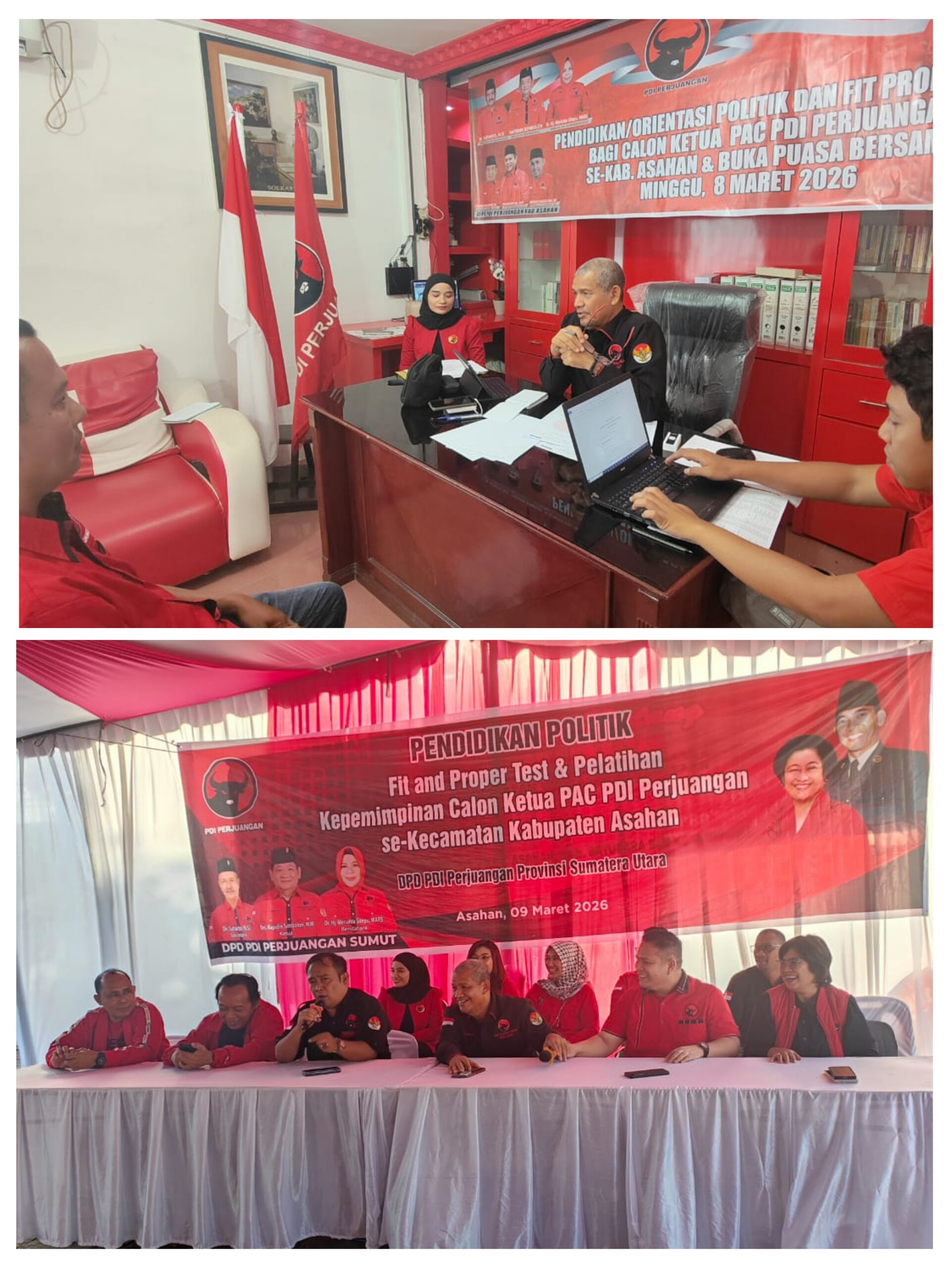 Dewan Pimpinan Daerah Partai Demokrasi Indonesia Perjuangan (DPD PDI Perjuangan) Provinsi Sumatera Utara melaksanakan pendidikan/orientasi politik dan fit and proper test dan pelatihan kepemimpinan calon Ketua PAC Perjuangan se-Kabupaten Asahan di kantor Sekretariat DPC PDI-Perjuangan Kabupaten Asahan, Minggu (8/3/2026).